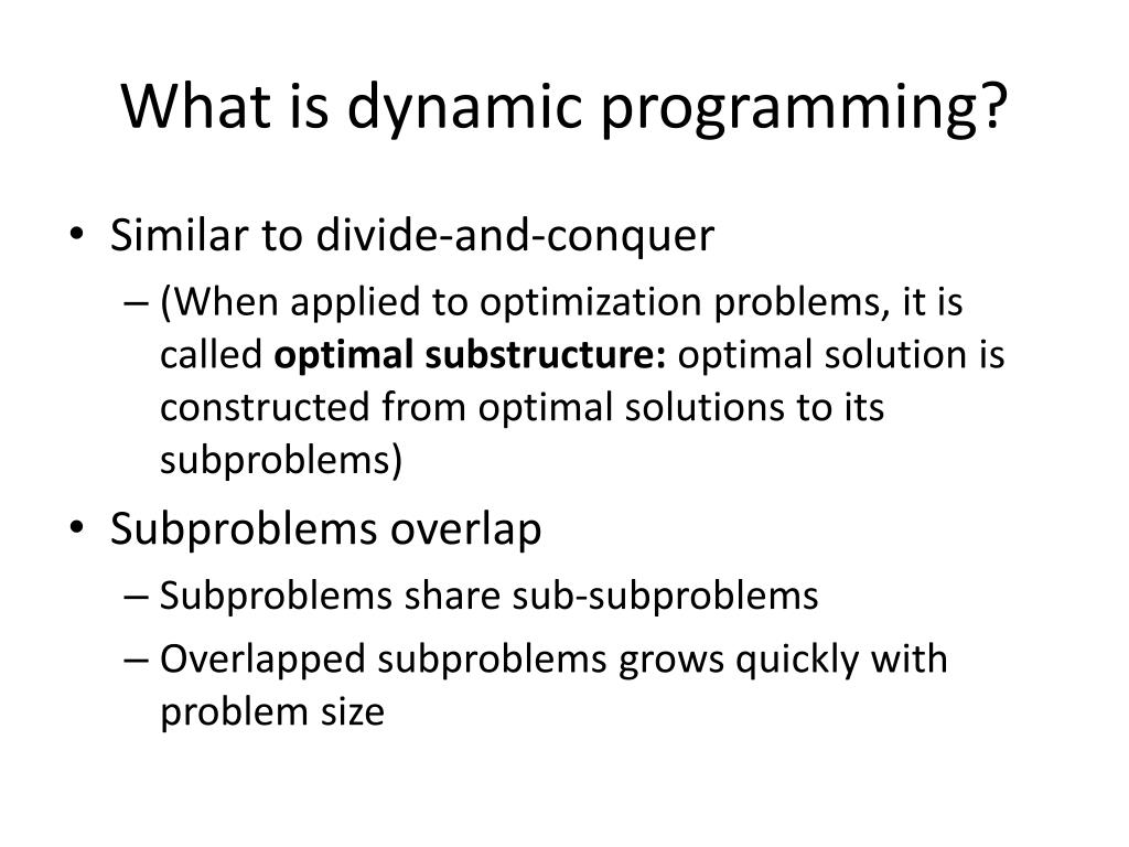 What is dynamic programming? • Similar to divide-and-conquer • (When applied to optimization problems, it is called optimal substructure: optimal solution is constructed from optimal solutions to its subproblems) • Subproblems overlap • Subproblems share sub-subproblems • Overlapped subproblems grows quickly with problem size