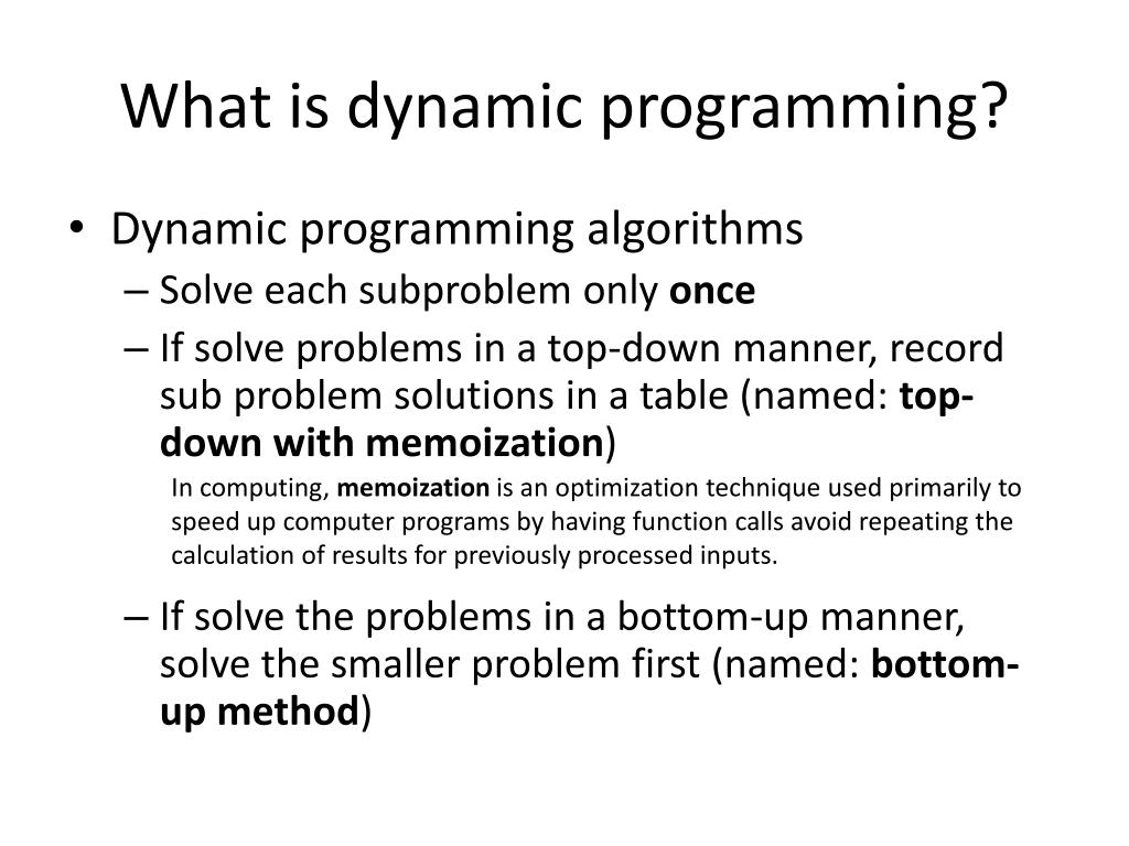What is dynamic programming? • Dynamic programming algorithms • Solve each subproblem only once • If solve problems in a top-down manner, record sub problem solutions in a table (named: top-down with memoization) • If solve the problems in a bottom-up manner, solve the smaller problem first (named: bottom-up method) In computing, memoization is an optimization technique used primarily to speed up computer programs by having function calls avoid repeating the calculation of results for previously processed inputs.