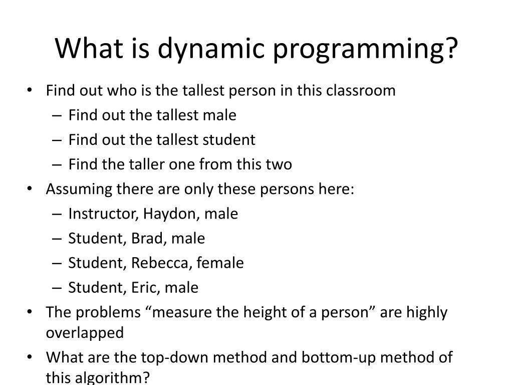 What is dynamic programming? • Find out who is the tallest person in this classroom • Find out the tallest male • Find out the tallest student • Find the taller one from this two • Assuming there are only these persons here: • Instructor, Haydon, male • Student, Brad, male • Student, Rebecca, female • Student, Eric, male • The problems “measure the height of a person” are highly overlapped • What are the top-down method and bottom-up method of this algorithm?