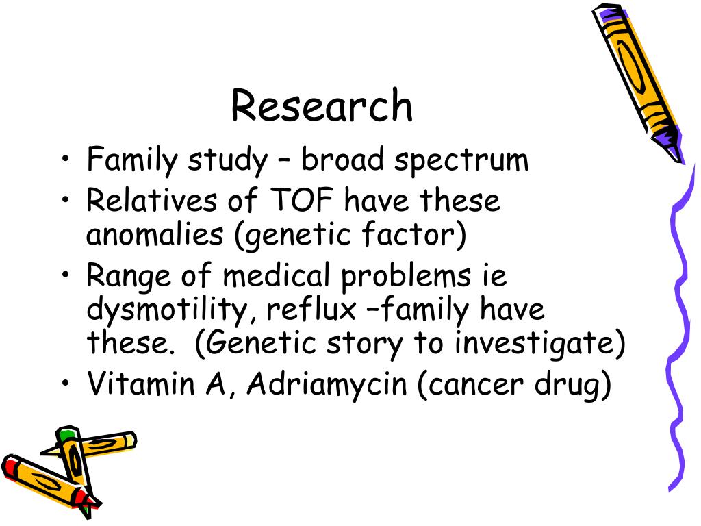 Research • Family study – broad spectrum • Relatives of TOF have these anomalies (genetic factor) • Range of medical problems ie dysmotility, reflux –family have these. (Genetic story to investigate) • Vitamin A, Adriamycin (cancer drug)