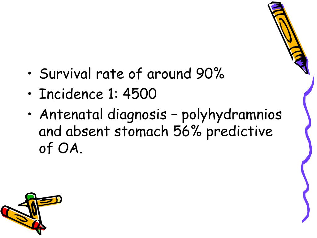 Survival rate of around 90% • Incidence 1: 4500 • Antenatal diagnosis – polyhydramnios and absent stomach 56% predictive of OA.