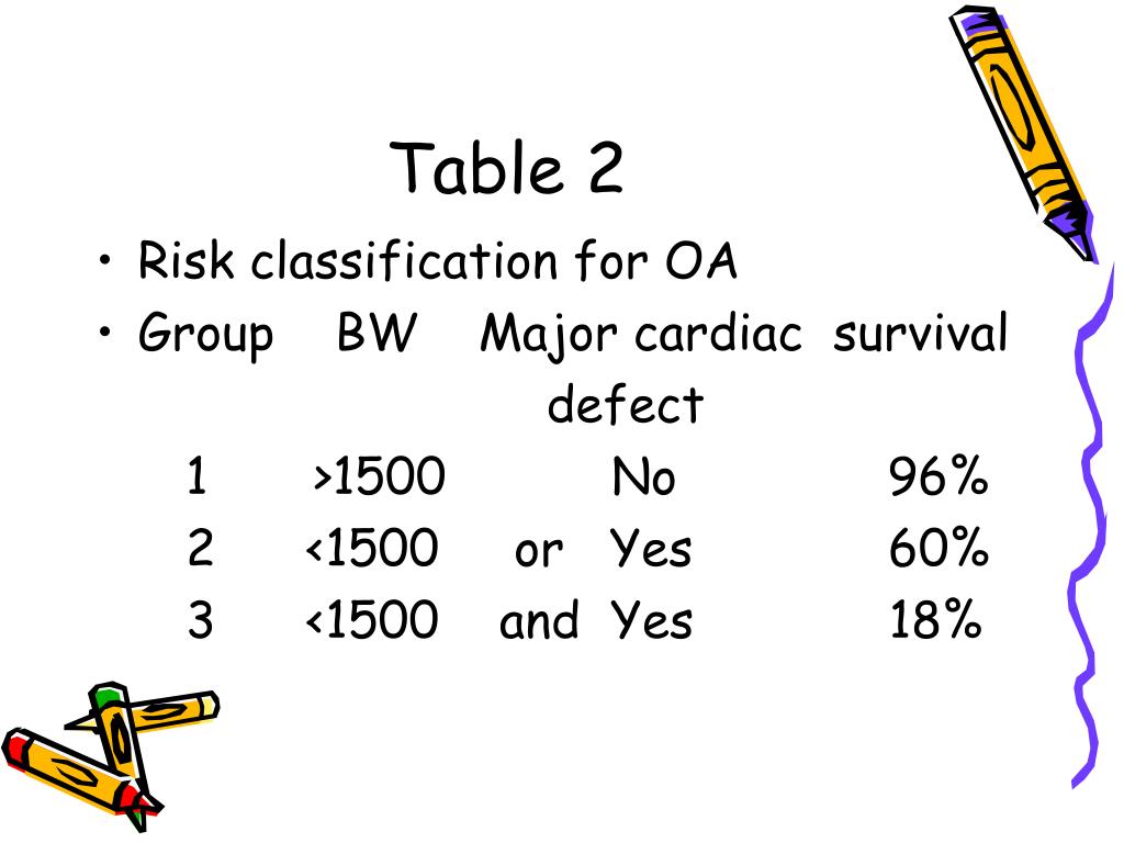 Table 2 • Risk classification for OA • Group BW Major cardiac survival defect 1 >1500 No 96% 2 <1500 or Yes 60% 3 <1500 and Yes 18%
