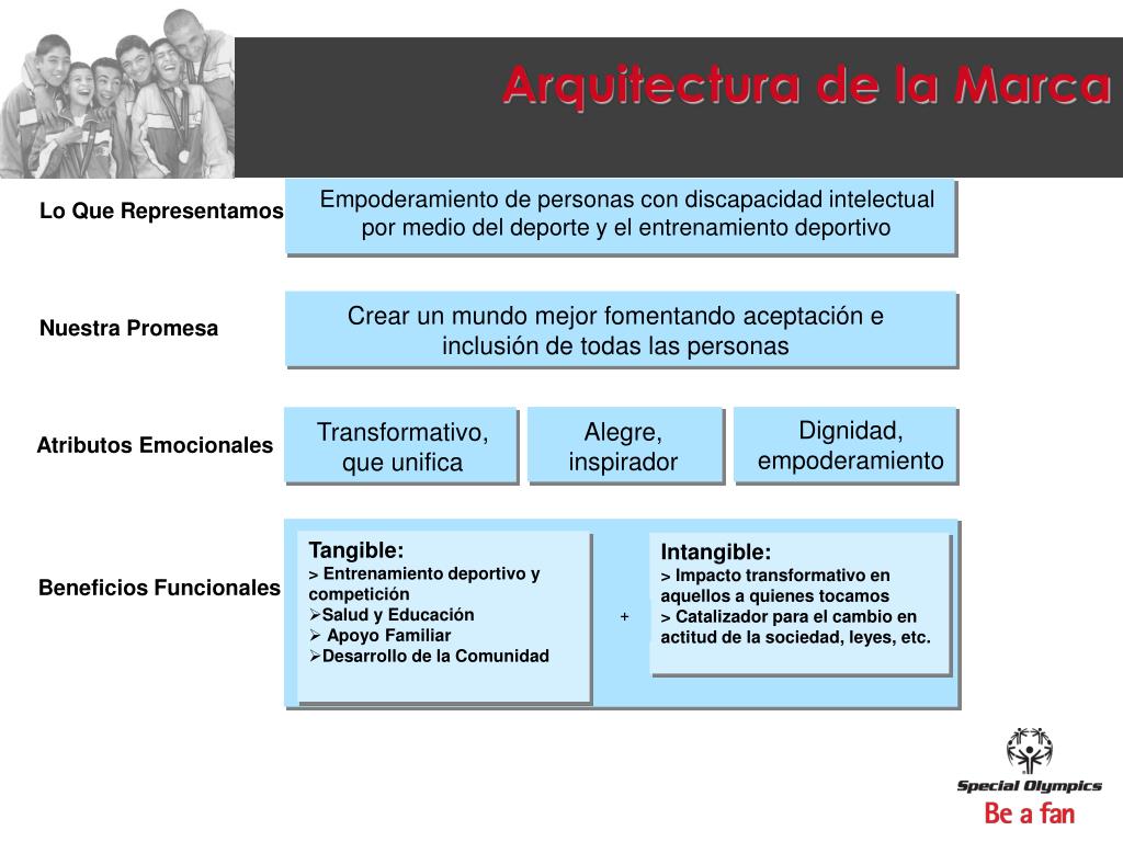 Arquitectura de la Marca Empoderamiento de personas con discapacidad intelectual por medio del deporte y el entrenamiento deportivo Lo Que Representamos Crear un mundo mejor fomentando aceptación e inclusión de todas las personas Nuestra Promesa Dignidad, empoderamiento Alegre, inspirador Transformativo, que unifica Atributos Emocionales • Tangible:> Entrenamiento deportivo y competición • Salud y Educación • Apoyo Familiar • Desarrollo de la Comunidad Intangible:> Impacto transformativo en aquellos a quienes tocamos> Catalizador para el cambio en actitud de la sociedad, leyes, etc. Beneficios Funcionales +
