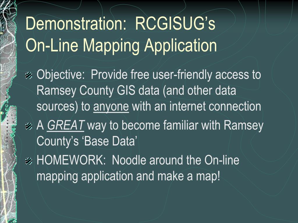 Demonstration: RCGISUG’sOn-Line Mapping Application • Objective: Provide free user-friendly access to Ramsey County GIS data (and other data sources) to anyone with an internet connection • A GREAT way to become familiar with Ramsey County’s ‘Base Data’ • HOMEWORK: Noodle around the On-line mapping application and make a map!