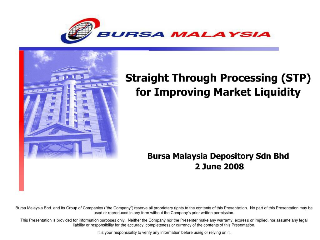 Straight Through Processing (STP) for Improving Market LiquidityBursa Malaysia Depository Sdn Bhd 2 June 2008 Bursa Malaysia Bhd. and its Group of Companies (“the Company”) reserve all proprietary rights to the contents of this Presentation. No part of this Presentation may be used or reproduced in any form without the Company’s prior written permission. This Presentation is provided for information purposes only. Neither the Company nor the Presenter make any warranty, express or implied, nor assume any legal liability or responsibility for the accuracy, completeness or currency of the contents of this Presentation. It is your responsibility to verify any information before using or relying on it.