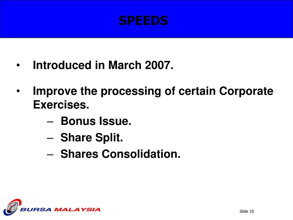 SPEEDS • Introduced in March 2007. • Improve the processing of certain Corporate Exercises. • Bonus Issue. • Share Split. • Shares Consolidation.