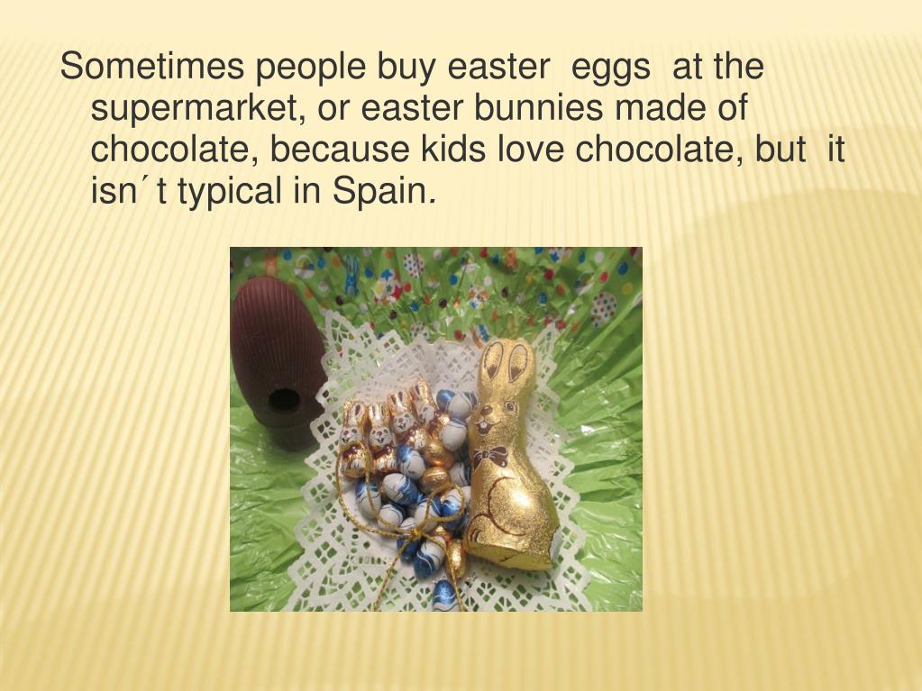 Sometimespeoplebuyeastereggs at thesupermarket, oreasterbunniesmade of chocolate, becausekidslovechocolate, butitisn´ttypical in Spain.
