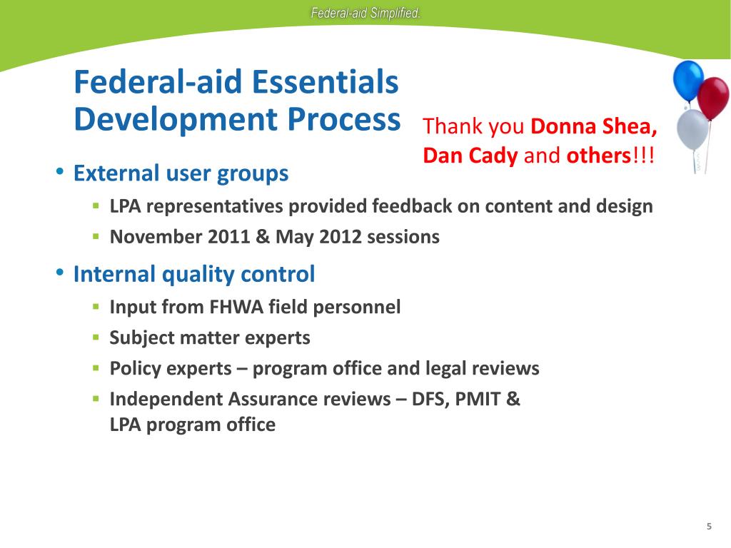 Federal-aid Essentials Development Process Thank you Donna Shea, Dan Cady and others!!! • External user groups • LPA representatives provided feedback on content and design • November 2011 & May 2012 sessions • Internal quality control • Input from FHWA field personnel • Subject matter experts • Policy experts – program office and legal reviews • Independent Assurance reviews – DFS, PMIT & LPA program office