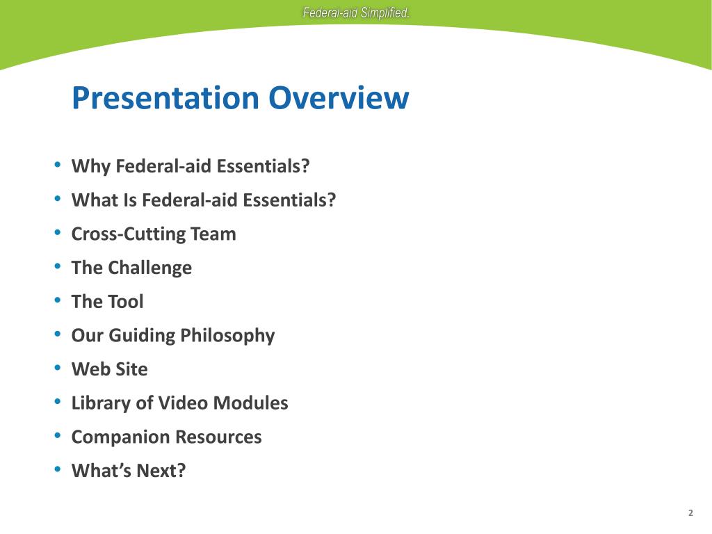 Federal-aid Essentials for Local Public Agencies. Presentation Overview. Why Federal-aid Essentials? What Is Federal-aid Essentials? Cross-Cutting Team The Challenge The Tool Our Guiding Philosophy Web Site Library of Video Modules Companion Resources What’s Next?.
