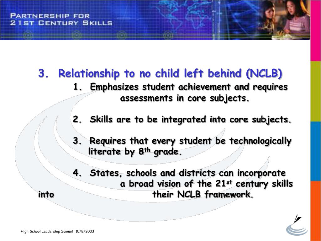 3. Relationship to no child left behind (NCLB) 1. Emphasizes student achievement and requires assessments in core subjects.2. Skills are to be integrated into core subjects. 3. Requires that every student be technologically literate by 8th grade. 4. States, schools and districts can incorporate a broad vision of the 21st century skills into their NCLB framework. High School Leadership Summit 10/8/2003