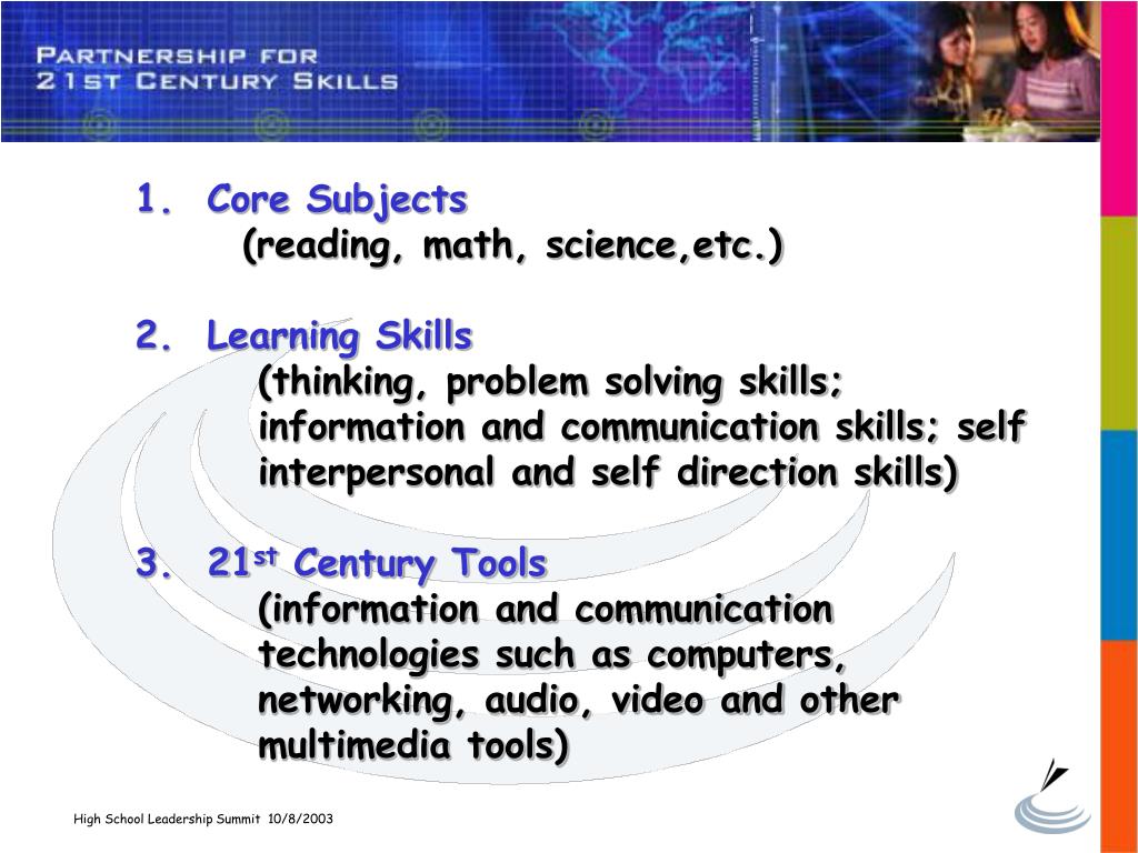1. Core Subjects (reading, math, science,etc.)2. Learning Skills (thinking, problem solving skills; information and communication skills; self interpersonal and self direction skills) 3. 21st Century Tools (information and communication technologies such as computers, networking, audio, video and other multimedia tools) High School Leadership Summit 10/8/2003