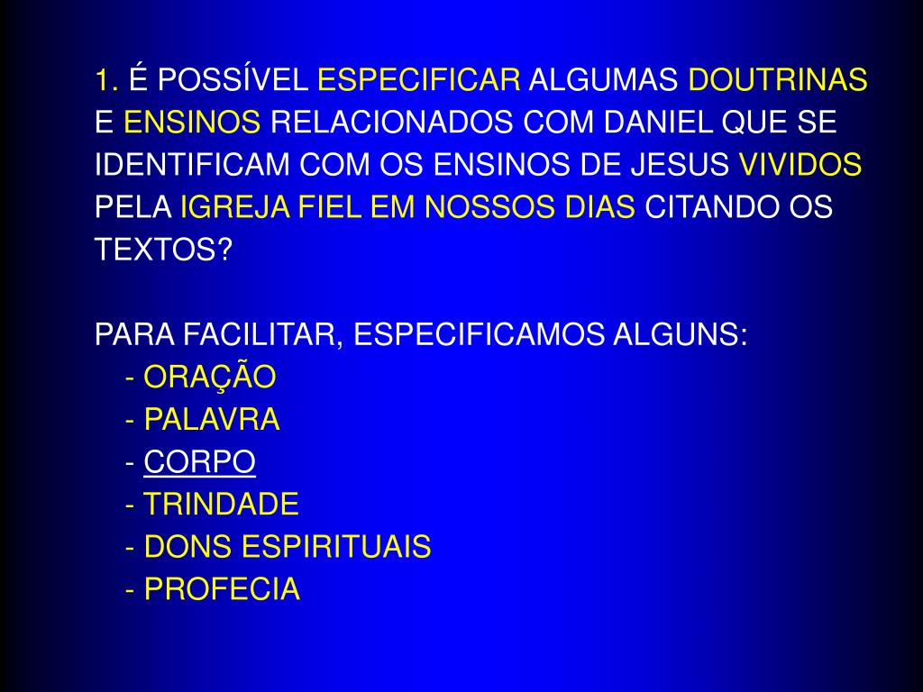 1. É POSSÍVEL ESPECIFICAR ALGUMAS DOUTRINAS E ENSINOS RELACIONADOS COM DANIEL QUE SE IDENTIFICAM COM OS ENSINOS DE JESUS VIVIDOS PELA IGREJA FIEL EM NOSSOS DIAS CITANDO OS TEXTOS? PARA FACILITAR, ESPECIFICAMOS ALGUNS: - ORAÇÃO - PALAVRA - CORPO - TRINDADE - DONS ESPIRITUAIS - PROFECIA