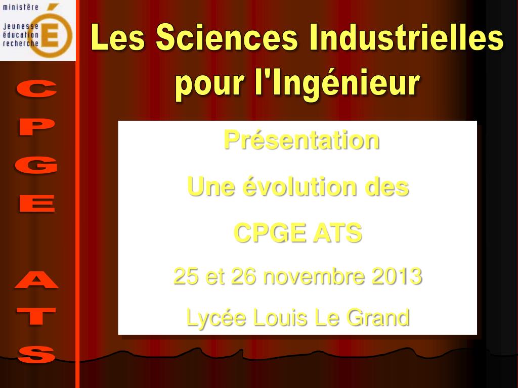 Les Sciences Industrielles pour l'Ingénieur Présentation Une évolution des CPGE ATS 25 et 26 novembre 2013 Lycée Louis Le Grand CPGE ATS