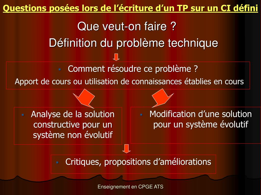Questions posées lors de l’écriture d’un TP sur un CI défini Que veut-on faire ? Définition du problème technique • Comment résoudre ce problème ? Apport de cours ou utilisation de connaissances établies en cours • Modification d’une solution pour un système évolutif • Analyse de la solution constructive pour un système non évolutif • Critiques, propositions d’améliorations Enseignement en CPGE ATS