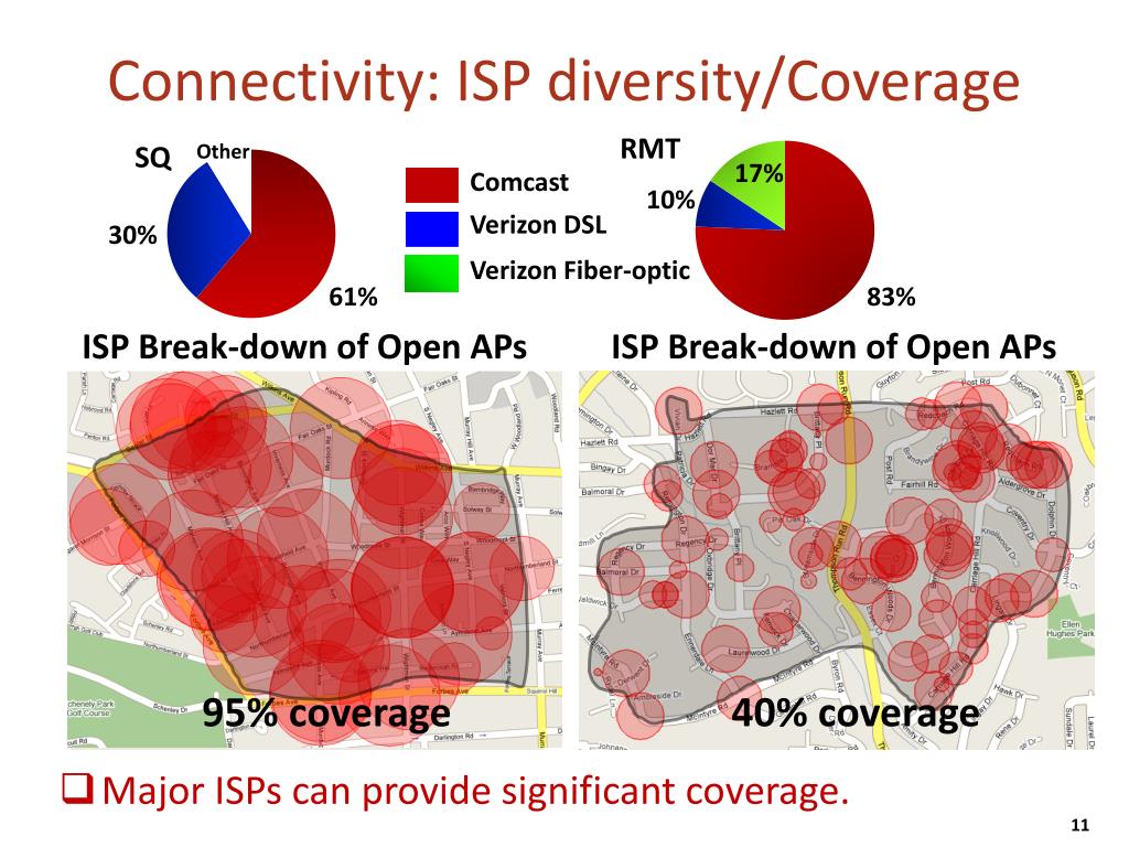 Connectivity: ISP diversity/Coverage RMT SQ Other 17% 10% • Major ISPs can provide significant coverage. 30% Comcast 61% 83% VerizonDSL ISP Break-down of Open APs ISP Break-down of Open APs Verizon Fiber-optic 95% coverage 40% coverage 98 % coverage 48 % coverage
