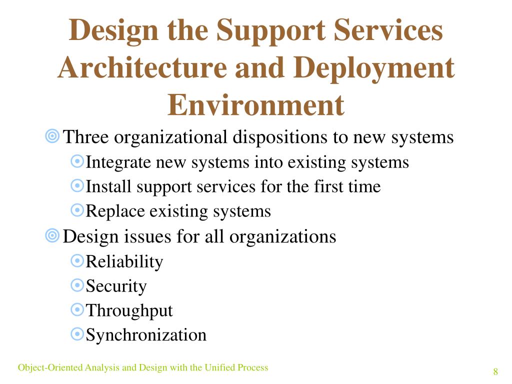 Design the Support Services Architecture and Deployment Environment • Three organizational dispositions to new systems • Integrate new systems into existing systems • Install support services for the first time • Replace existing systems • Design issues for all organizations • Reliability • Security • Throughput • Synchronization Object-Oriented Analysis and Design with the Unified Process