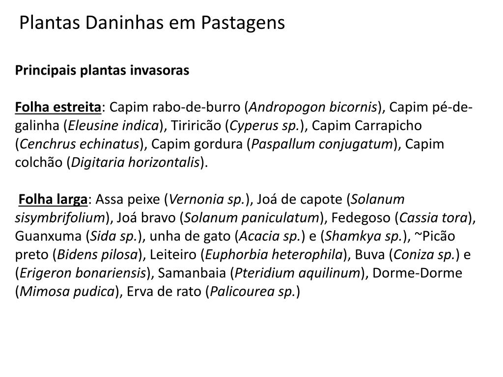 Plantas Daninhas em Pastagens Principais plantas invasoras Folha estreita: Capim rabo-de-burro (Andropogonbicornis), Capim pé-de-galinha (Eleusine indica), Tiriricão (Cyperussp.), Capim Carrapicho (Cenchrusechinatus), Capim gordura (Paspallumconjugatum), Capim colchão (Digitaria horizontalis). Folha larga: Assa peixe (Vernoniasp.), Joá de capote (Solanumsisymbrifolium), Joá bravo (Solanumpaniculatum), Fedegoso (Cassia tora), Guanxuma (Sida sp.), unha de gato (Acaciasp.) e (Shamkyasp.), ~Picão preto (Bidens pilosa), Leiteiro (Euphorbiaheterophila), Buva (Conizasp.) e (Erigeronbonariensis), Samanbaia (Pteridiumaquilinum), Dorme-Dorme (Mimosa pudica), Erva de rato (Palicoureasp.)