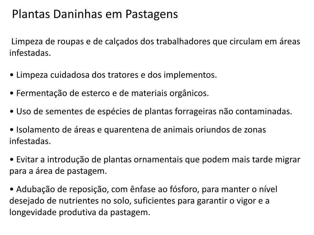 Plantas Daninhas em Pastagens Limpeza de roupas e de calçados dos trabalhadores que circulam em áreasinfestadas.• Limpeza cuidadosa dos tratores e dos implementos.• Fermentação de esterco e de materiais orgânicos. • Uso de sementes de espécies de plantas forrageiras não contaminadas.• Isolamento de áreas e quarentena de animais oriundos de zonas infestadas.• Evitar a introdução de plantas ornamentais que podem mais tarde migrarpara a área de pastagem.• Adubação de reposição, com ênfase ao fósforo, para manter o níveldesejado de nutrientes no solo, suficientes para garantir o vigor e alongevidade produtiva da pastagem.