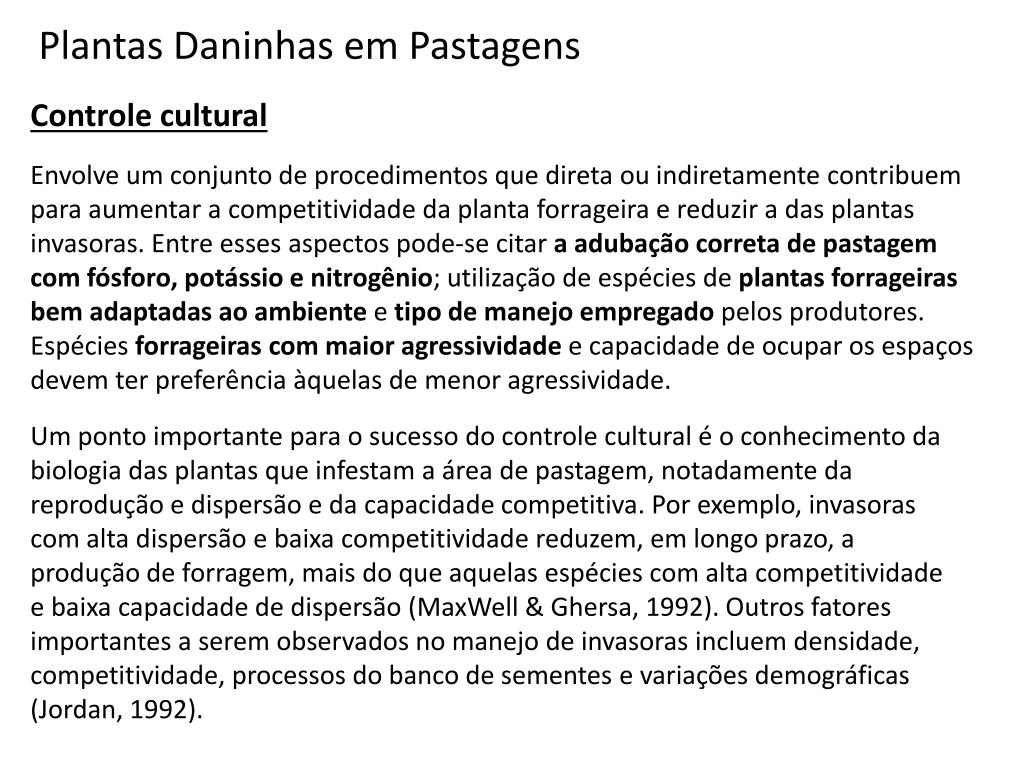 Plantas Daninhas em Pastagens Controle culturalEnvolve um conjunto de procedimentos que direta ou indiretamente contribuempara aumentar a competitividade da planta forrageira e reduzir a das plantasinvasoras. Entre esses aspectos pode-se citar a adubação correta de pastagem com fósforo, potássio e nitrogênio; utilização de espécies de plantas forrageiras bem adaptadas ao ambiente e tipo de manejo empregado pelos produtores. Espécies forrageiras com maior agressividade e capacidade de ocupar os espaços devem ter preferência àquelas de menor agressividade.Um ponto importante para o sucesso do controle cultural é o conhecimento dabiologia das plantas que infestam a área de pastagem, notadamente dareprodução e dispersão e da capacidade competitiva. Por exemplo, invasorascom alta dispersão e baixa competitividade reduzem, em longo prazo, aprodução de forragem, mais do que aquelas espécies com alta competitividadee baixa capacidade de dispersão (MaxWell & Ghersa, 1992). Outros fatores importantes a serem observados no manejo de invasoras incluem densidade,competitividade, processos do banco de sementes e variações demográficas(Jordan, 1992).