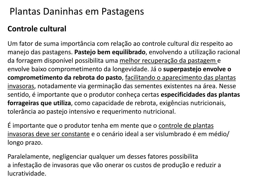 Plantas Daninhas em Pastagens Controle culturalUm fator de suma importância com relação ao controle cultural diz respeito aomanejo das pastagens. Pastejo bem equilibrado, envolvendo a utilização racional da forragem disponível possibilita uma melhor recuperação da pastagem e envolve baixo comprometimento da longevidade. Já o superpastejo envolve o comprometimento da rebrota do pasto, facilitando o aparecimento das plantas invasoras, notadamente via germinação das sementes existentes na área. Nesse sentido, é importante que o produtor conheça certas especificidades das plantas forrageiras que utiliza, como capacidade de rebrota, exigências nutricionais, tolerância ao pastejo intensivo e requerimento nutricional.É importante que o produtor tenha em mente que o controle de plantasinvasoras deve ser constante e o cenário ideal a ser vislumbrado é em médio/longo prazo. Paralelamente, negligenciar qualquer um desses fatores possibilitaa infestação de invasoras que vão onerar os custos de produção e reduzir alucratividade.