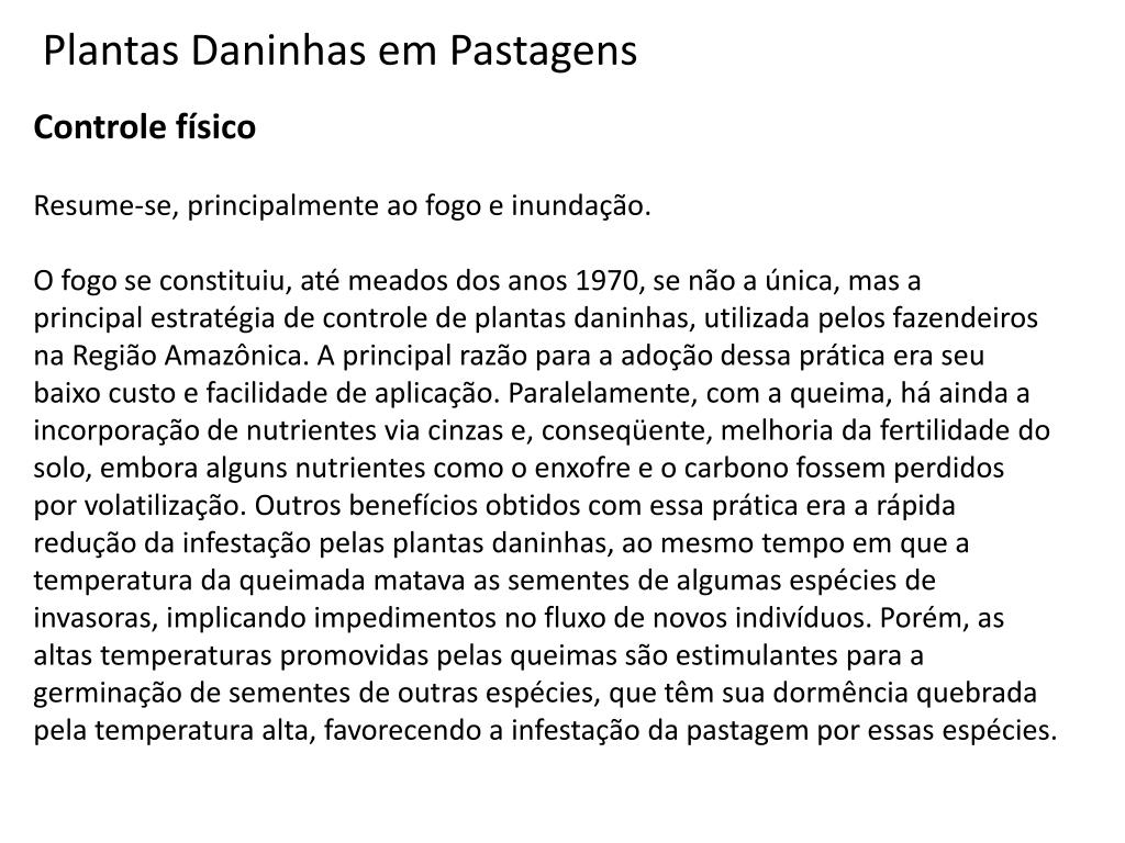 Plantas Daninhas em Pastagens Controle físicoResume-se, principalmente ao fogo e inundação.O fogo se constituiu, até meados dos anos 1970, se não a única, mas aprincipal estratégia de controle de plantas daninhas, utilizada pelos fazendeirosna Região Amazônica. A principal razão para a adoção dessa prática era seubaixo custo e facilidade de aplicação. Paralelamente, com a queima, há ainda aincorporação de nutrientes via cinzas e, conseqüente, melhoria da fertilidade dosolo, embora alguns nutrientes como o enxofre e o carbono fossem perdidospor volatilização. Outros benefícios obtidos com essa prática era a rápidaredução da infestação pelas plantas daninhas, ao mesmo tempo em que atemperatura da queimada matava as sementes de algumas espécies deinvasoras, implicando impedimentos no fluxo de novos indivíduos. Porém, asaltas temperaturas promovidas pelas queimas são estimulantes para agerminação de sementes de outras espécies, que têm sua dormência quebrada pela temperatura alta, favorecendo a infestação da pastagem por essas espécies.