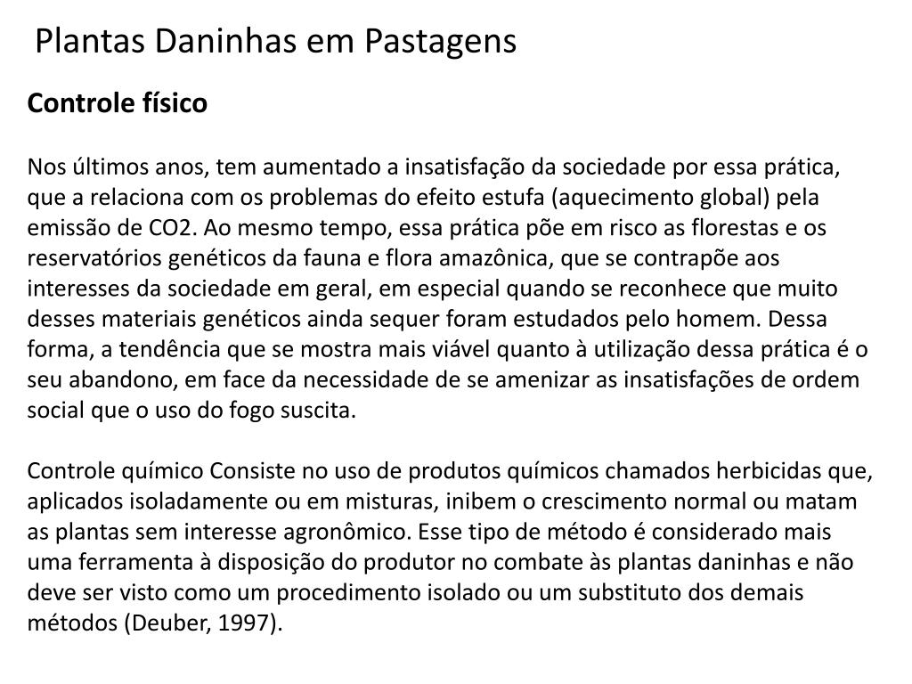 Plantas Daninhas em Pastagens Controle físicoNos últimos anos, tem aumentado a insatisfação da sociedade por essa prática, que a relaciona com os problemas do efeito estufa (aquecimento global) pela emissão de CO2. Ao mesmo tempo, essa prática põe em risco as florestas e os reservatórios genéticos da fauna e flora amazônica, que se contrapõe aos interesses da sociedade em geral, em especial quando se reconhece que muito desses materiais genéticos ainda sequer foram estudados pelo homem. Dessa forma, a tendência que se mostra mais viável quanto à utilização dessa prática é o seu abandono, em face da necessidade de se amenizar as insatisfações de ordem social que o uso do fogo suscita.Controle químico Consiste no uso de produtos químicos chamados herbicidas que, aplicados isoladamente ou em misturas, inibem o crescimento normal ou matam as plantas sem interesse agronômico. Esse tipo de método é considerado mais uma ferramenta à disposição do produtor no combate às plantas daninhas e não deve ser visto como um procedimento isolado ou um substituto dos demais métodos (Deuber, 1997).