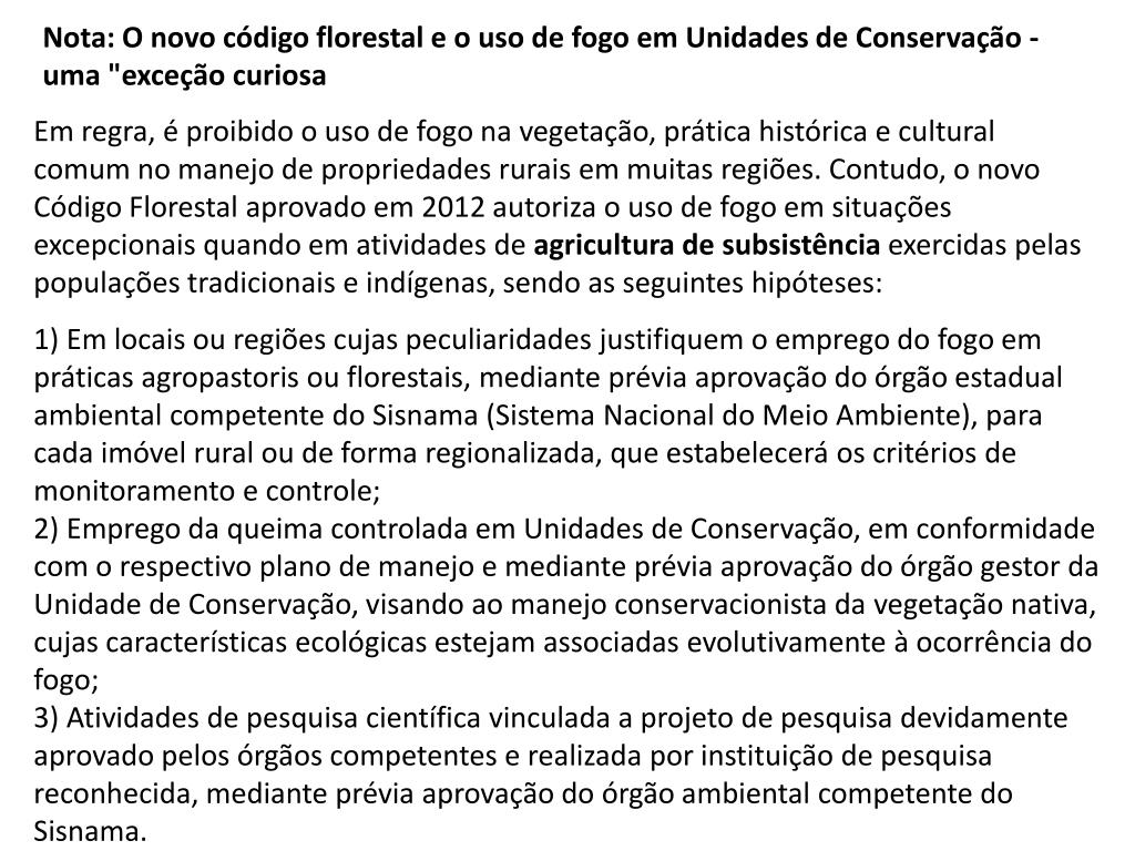 Nota: O novo código florestal e o uso de fogo em Unidades de Conservação - uma "exceção curiosa Em regra, é proibido o uso de fogo na vegetação, prática histórica e cultural comum no manejo de propriedades rurais em muitas regiões. Contudo, o novo Código Florestal aprovado em 2012 autoriza o uso de fogo em situações excepcionais quando em atividades de agricultura de subsistência exercidas pelas populações tradicionais e indígenas, sendo as seguintes hipóteses: 1) Em locais ou regiões cujas peculiaridades justifiquem o emprego do fogo em práticas agropastoris ou florestais, mediante prévia aprovação do órgão estadual ambiental competente do Sisnama (Sistema Nacional do Meio Ambiente), para cada imóvel rural ou de forma regionalizada, que estabelecerá os critérios de monitoramento e controle; 2) Emprego da queima controlada em Unidades de Conservação, em conformidade com o respectivo plano de manejo e mediante prévia aprovação do órgão gestor da Unidade de Conservação, visando ao manejo conservacionista da vegetação nativa, cujas características ecológicas estejam associadas evolutivamente à ocorrência do fogo; 3) Atividades de pesquisa científica vinculada a projeto de pesquisa devidamente aprovado pelos órgãos competentes e realizada por instituição de pesquisa reconhecida, mediante prévia aprovação do órgão ambiental competente do Sisnama.