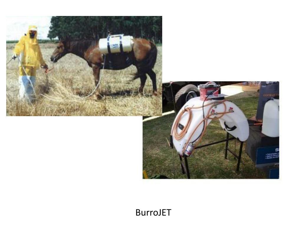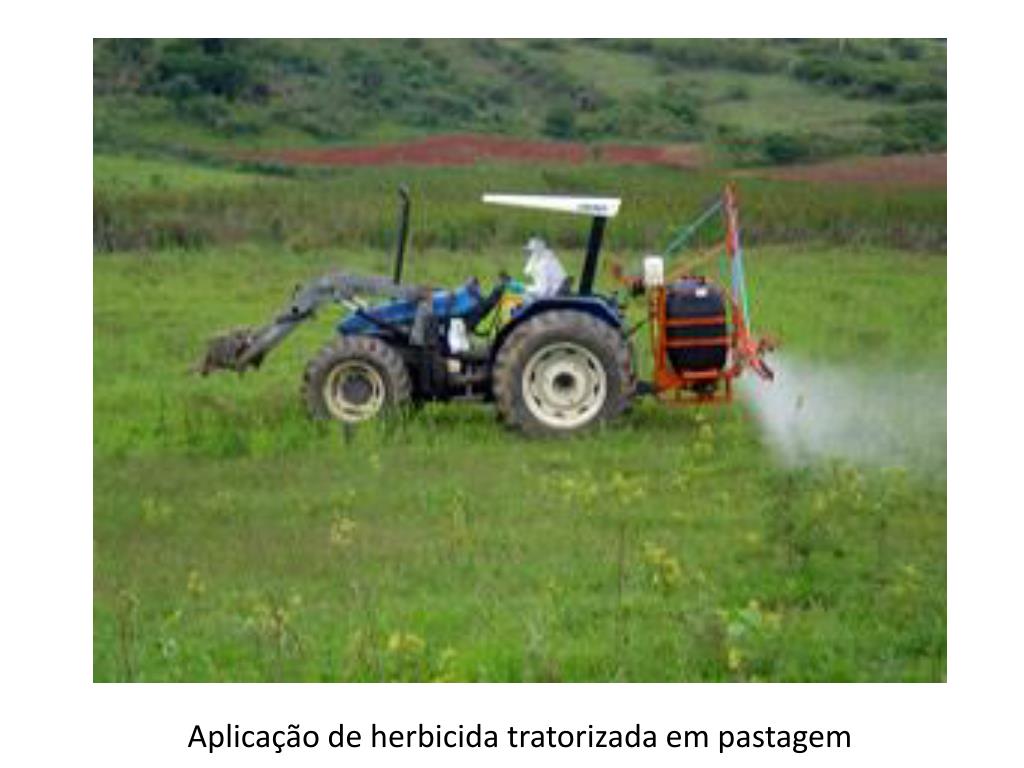 Plantas Daninhas em Pastagens Métodos de controle das plantas daninhas O uso de herbicidas combinado com o método mecânico torna mais eficiente o controle de plantas arbustivas. Contudo, o uso de herbicidas precisa ser racional, ajustando-se às necessidades específicas da pastagem, levando em conta as espécies de plantas daninhas a serem controladas, calibração do jato aspersordo pulverizador, o uso de dosagens recomendadas, evitar a aplicação em períodos de estiagem, nebulosidade, excesso de chuvas, horas de calor, umidade relativa do ar inferior a 60%, ventos superiores a 10 km/h e aplicar o produto com as plantas daninhas em bom estado vegetativo.