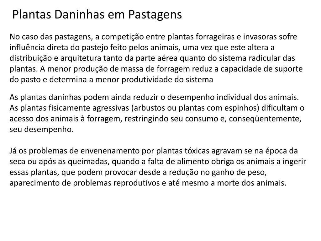 Plantas Daninhas em Pastagens No caso das pastagens, a competição entre plantas forrageiras e invasoras sofre influência direta do pastejo feito pelos animais, uma vez que este altera a distribuição e arquitetura tanto da parte aérea quanto do sistema radicular das plantas. A menor produção de massa de forragem reduz a capacidade de suporte do pasto e determina a menor produtividade do sistema As plantas daninhas podem ainda reduzir o desempenho individual dos animais. As plantas fisicamente agressivas (arbustos ou plantas com espinhos) dificultam o acesso dos animais à forragem, restringindo seu consumo e, conseqüentemente, seu desempenho. Já os problemas de envenenamento por plantas tóxicas agravam se na época da seca ou após as queimadas, quando a falta de alimento obriga os animais a ingerir essas plantas, que podem provocar desde a redução no ganho de peso, aparecimento de problemas reprodutivos e até mesmo a morte dos animais.