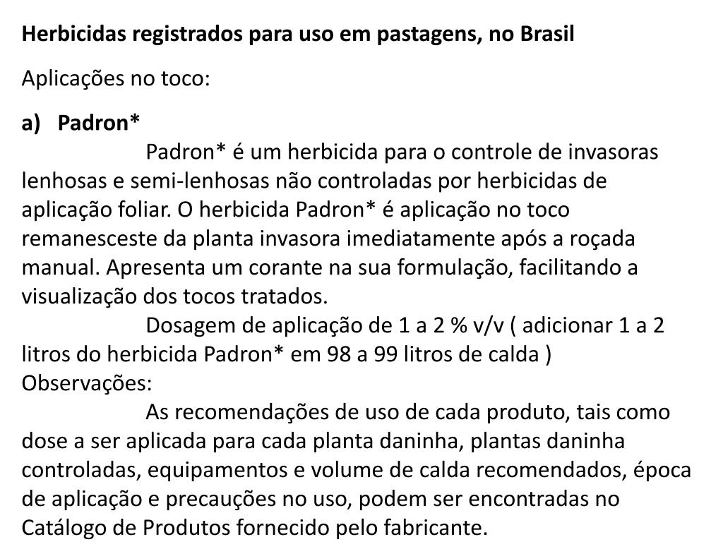 Herbicidas registrados para uso em pastagens, no Brasil Aplicações no toco: Padron* Padron* é um herbicida para o controle de invasoras lenhosas e semi-lenhosas não controladas por herbicidas de aplicação foliar. O herbicida Padron* é aplicação no toco remanesceste da planta invasora imediatamente após a roçada manual. Apresenta um corante na sua formulação, facilitando a visualização dos tocos tratados. Dosagem de aplicação de 1 a 2 % v/v ( adicionar 1 a 2 litros do herbicida Padron* em 98 a 99 litros de calda ) Observações: As recomendações de uso de cada produto, tais como dose a ser aplicada para cada planta daninha, plantas daninha controladas, equipamentos e volume de calda recomendados, época de aplicação e precauções no uso, podem ser encontradas no Catálogo de Produtos fornecido pelo fabricante.