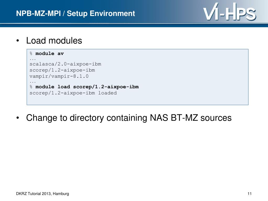 NPB-MZ-MPI / Setup Environment • Loadmodules • Change todirectorycontaining NAS BT-MZ sources % module av ... scalasca/2.0-aixpoe-ibm scorep/1.2-aixpoe-ibm vampir/vampir-8.1.0 ... % module load scorep/1.2-aixpoe-ibm scorep/1.2-aixpoe-ibm loaded