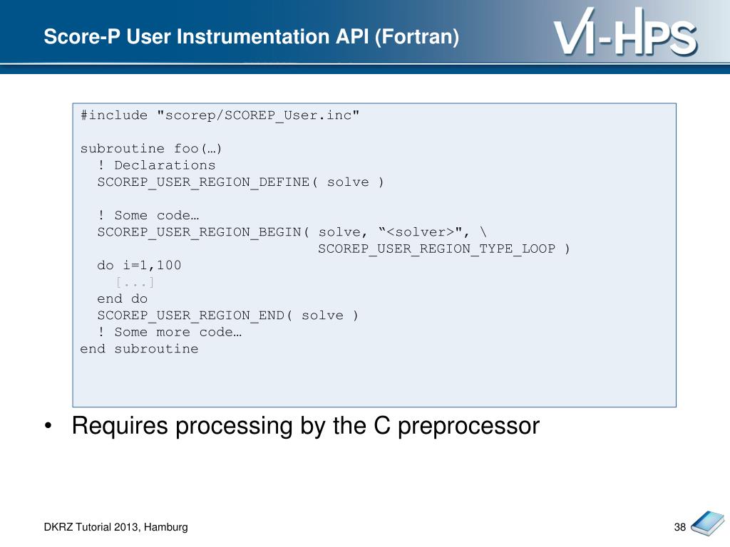 Score-P User Instrumentation API (C/C++) #include "scorep/SCOREP_User.h" void foo() { /* Declarations */ SCOREP_USER_REGION_DEFINE( solve ) /* Some code… */ SCOREP_USER_REGION_BEGIN( solve, “<solver>", \ SCOREP_USER_REGION_TYPE_LOOP ) for (i = 0; i < 100; i++) { [...] } SCOREP_USER_REGION_END( solve ) /* Some more code… */ }