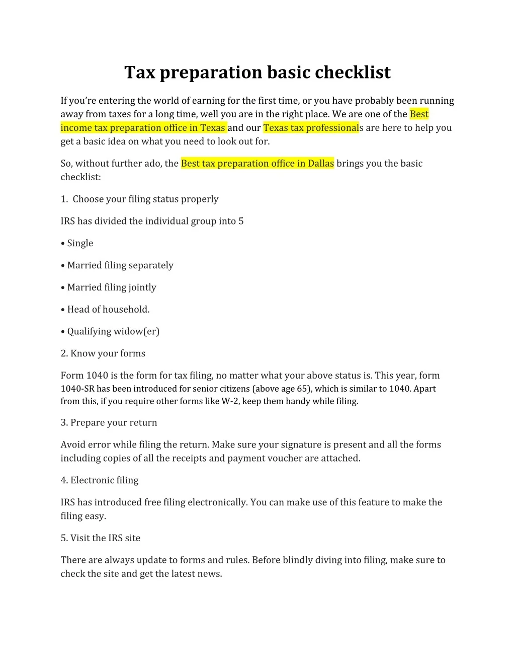 Tax preparation basic checklist If you’re entering the world of earning for the first time, or you have probably been running away from taxes for a long time, well you are in the right place. We are one of the Best income tax preparation office in Texas and our Texas tax professionals are here to help you get a basic idea on what you need to look out for. So, without further ado, the Best tax preparation office in Dallas brings you the basic checklist: 1. Choose your filing status properly IRS has divided the individual group into 5 • Single • Married filing separately • Married filing jointly • Head of household. • Qualifying widow(er) 2. Know your forms Form 1040 is the form for tax filing, no matter what your above status is. This year, form 1040-SR has been introduced for senior citizens (above age 65), which is similar to 1040. Apart from this, if you require other forms like W-2, keep them handy while filing. 3. Prepare your return Avoid error while filing the return. Make sure your signature is present and all the forms including copies of all the receipts and payment voucher are attached. 4. Electronic filing IRS has introduced free filing electronically. You can make use of this feature to make the filing easy. 5. Visit the IRS site There are always update to forms and rules. Before blindly diving into filing, make sure to check the site and get the latest news.