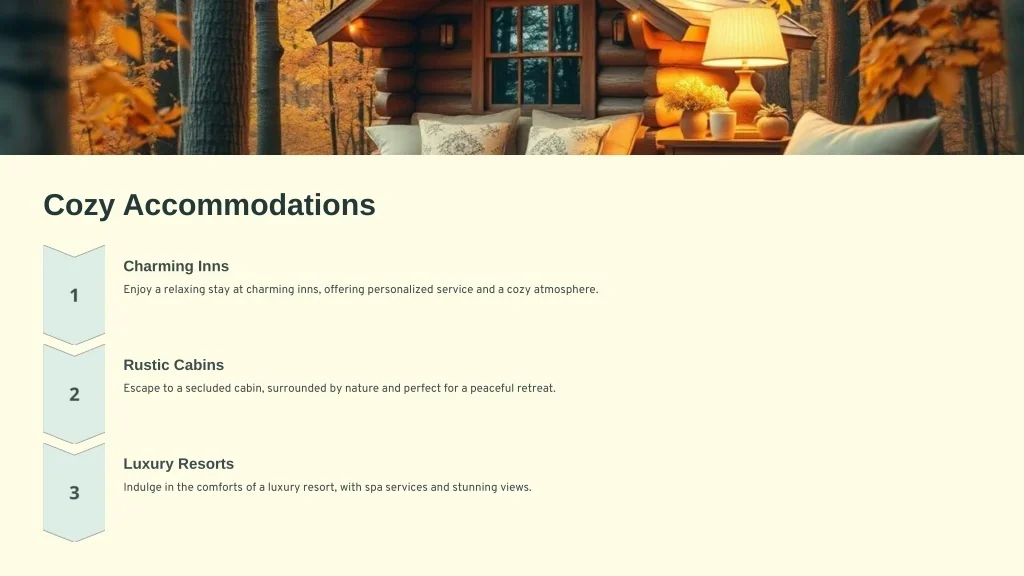 Cozy Accommodations Charming Inns Enjoy a relaxing stay at charming inns, offering personalized service and a cozy atmosphere. Rustic Cabins Escape to a secluded cabin, surrounded by nature and perfect for a peaceful retreat. Luxury Resorts Indulge in the comforts of a luxury resort, with spa services and stunning views.