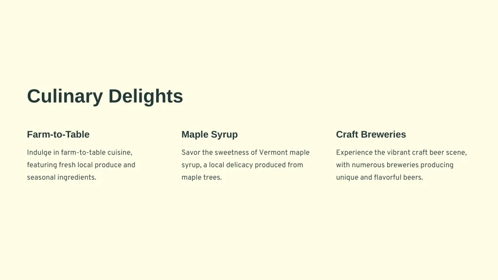 Culinary Delights Farm-to-Table Maple Syrup Craft Breweries Indulge in farm-to-table cuisine, featuring fresh local produce and seasonal ingredients. Savor the sweetness of Vermont maple syrup, a local delicacy produced from maple trees. Experience the vibrant craft beer scene, with numerous breweries producing unique and flavorful beers.