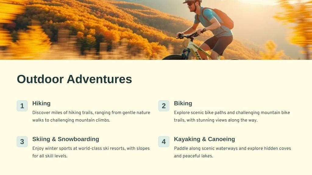 Outdoor Adventures Hiking Biking 1 2 Discover miles of hiking trails, ranging from gentle nature walks to challenging mountain climbs. Explore scenic bike paths and challenging mountain bike trails, with stunning views along the way. Skiing & Snowboarding Kayaking & Canoeing 3 4 Enjoy winter sports at world-class ski resorts, with slopes for all skill levels. Paddle along scenic waterways and explore hidden coves and peaceful lakes.