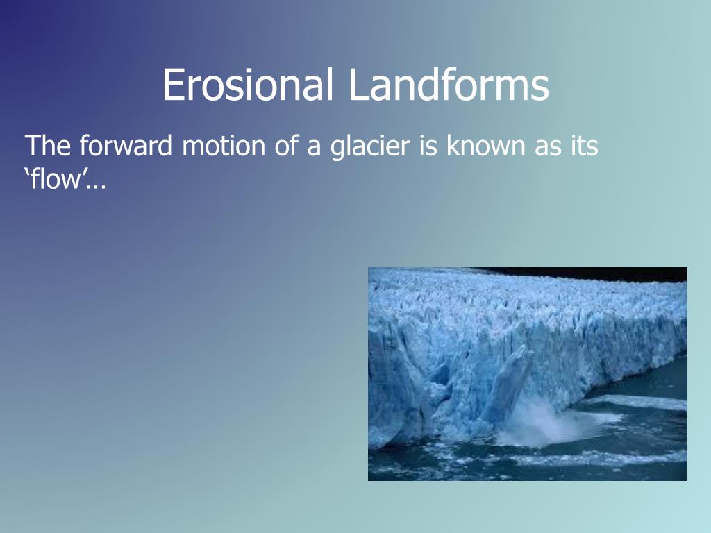Erosional Landforms The forward motion of a glacier is known as its ‘flow’…