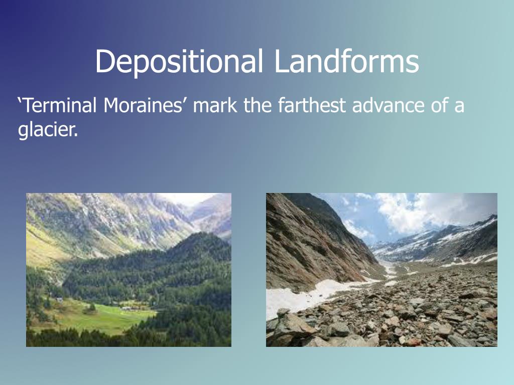 Depositional Landforms ‘Terminal Moraines’ mark the farthest advance of a glacier.