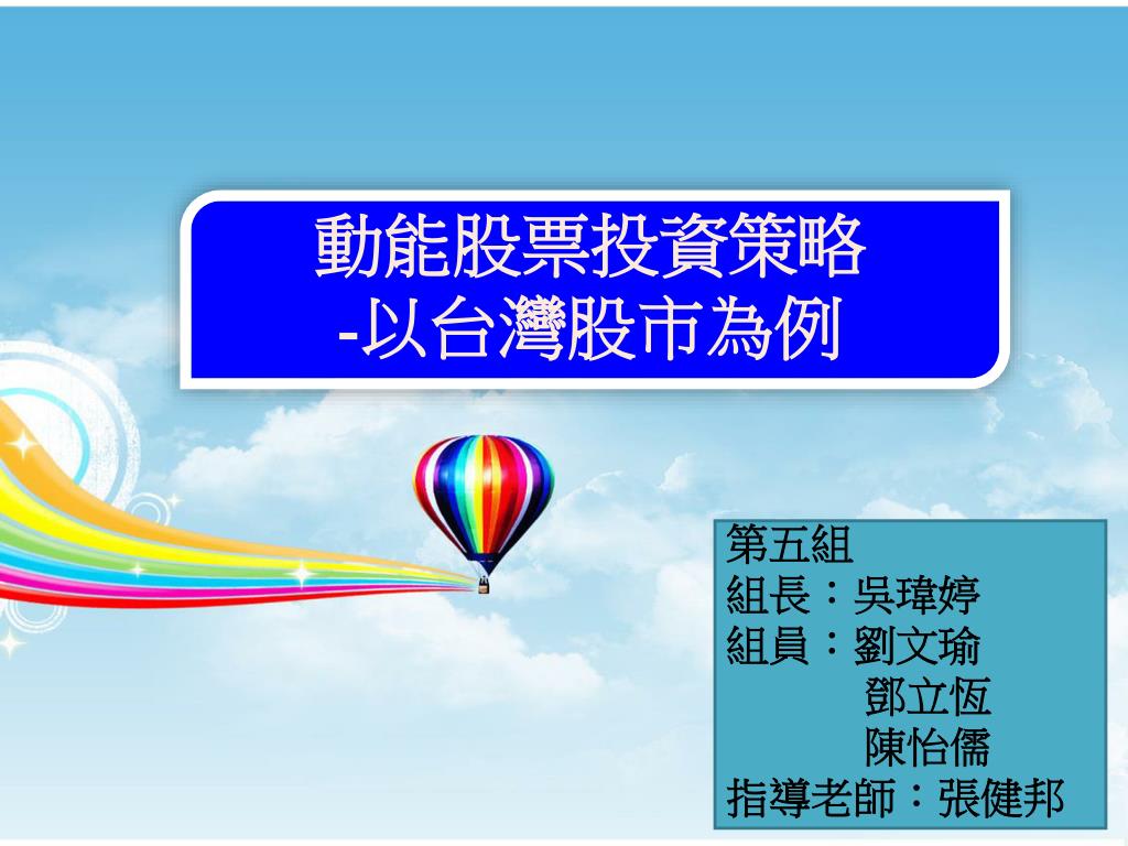 動能股票投資策略-以台灣股市為例 第五組 組長:吳瑋婷 組員:劉文瑜 鄧立恆 陳怡儒 指導老師:張健邦