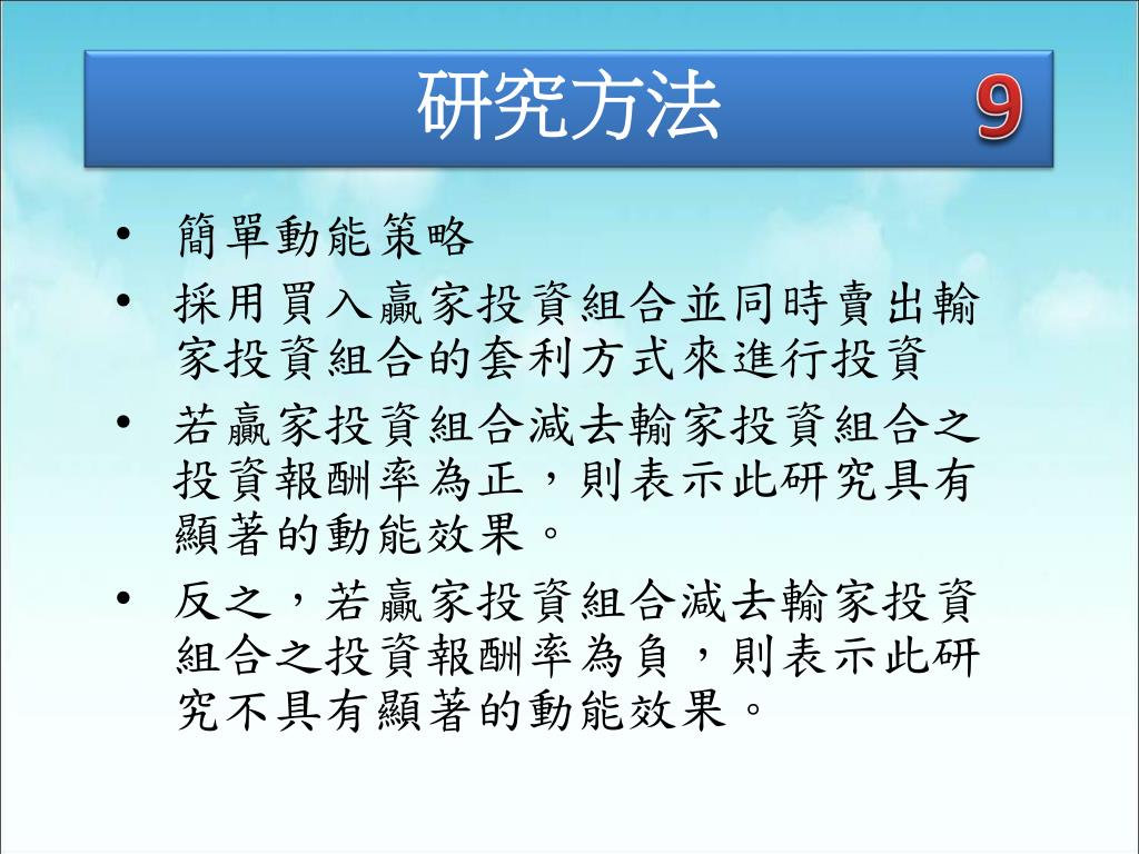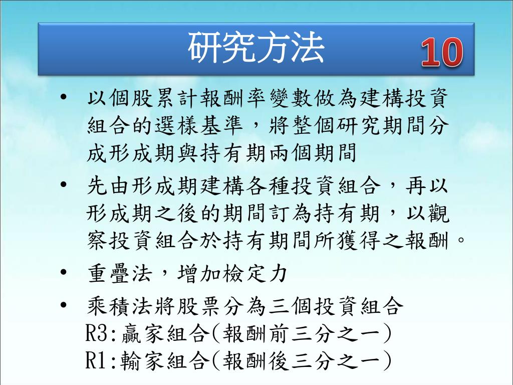 9 研究方法 簡單動能策略 採用買入贏家投資組合並同時賣出輸家投資組合的套利方式來進行投資 若贏家投資組合減去輸家投資組合之投資報酬率為正,則表示此研究具有顯著的動能效果。 反之,若贏家投資組合減去輸家投資組合之投資報酬率為負,則表示此研究不具有顯著的動能效果。