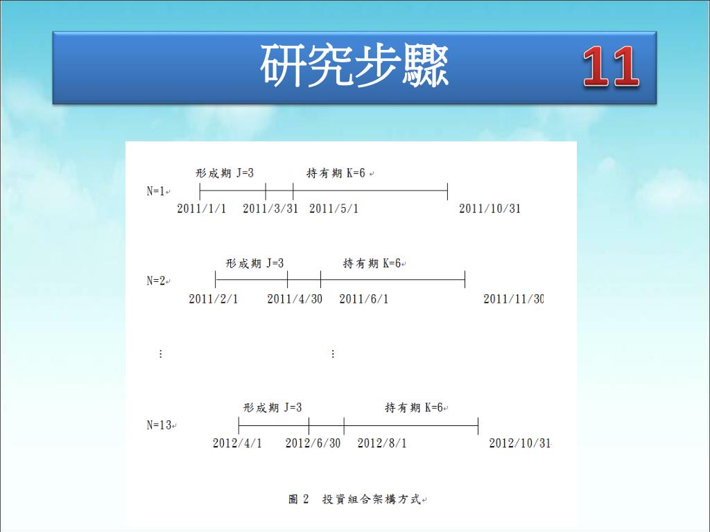 研究方法 10 以個股累計報酬率變數做為建構投資組合的選樣基準,將整個研究期間分成形成期與持有期兩個期間 先由形成期建構各種投資組合,再以形成期之後的期間訂為持有期,以觀察投資組合於持有期間所獲得之報酬。 重疊法,增加檢定力 乘積法將股票分為三個投資組合 R3:贏家組合(報酬前三分之一)R1:輸家組合(報酬後三分之一)