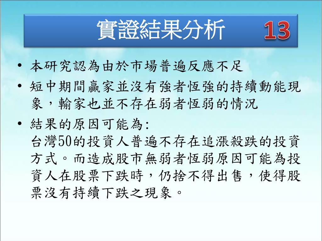 13 實證結果分析 • 本研究認為由於市場普遍反應不足 • 短中期間贏家並沒有強者恆強的持續動能現象,輸家也並不存在弱者恆弱的情況 • 結果的原因可能為:台灣50的投資人普遍不存在追漲殺跌的投資方式。而造成股市無弱者恆弱原因可能為投資人在股票下跌時,仍捨不得出售,使得股票沒有持續下跌之現象。