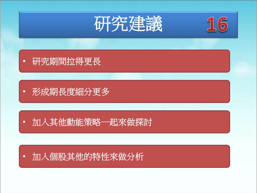 16 研究建議 • 研究期間拉得更長 • 形成期長度細分更多 • 加入其他動能策略一起來做探討 • 加入個股其他的特性來做分析