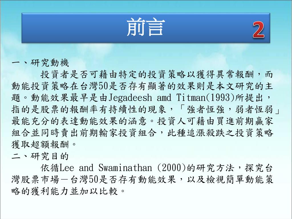 壹、前言 前言 2 一、研究動機 投資者是否可藉由特定的投資策略以獲得異常報酬,而動能投資策略在台灣50是否存有顯著的效果則是本文研究的主題。動能效果最早是由Jegadeeshamd Titman(1993)所提出,指的是股票的報酬率有持續性的現象,「強者恆強,弱者恆弱」最能充分的表達動能效果的涵意。投資人可藉由買進前期贏家組合並同時賣出前期輸家投資組合,此種追漲殺跌之投資策略獲取超額報酬。 二、研究目的 依循Lee and Swaminathan (2000)的研究方法,探究台灣股票市場-台灣50是否存有動能效果,以及檢視簡單動能策略的獲利能力並加以比較。