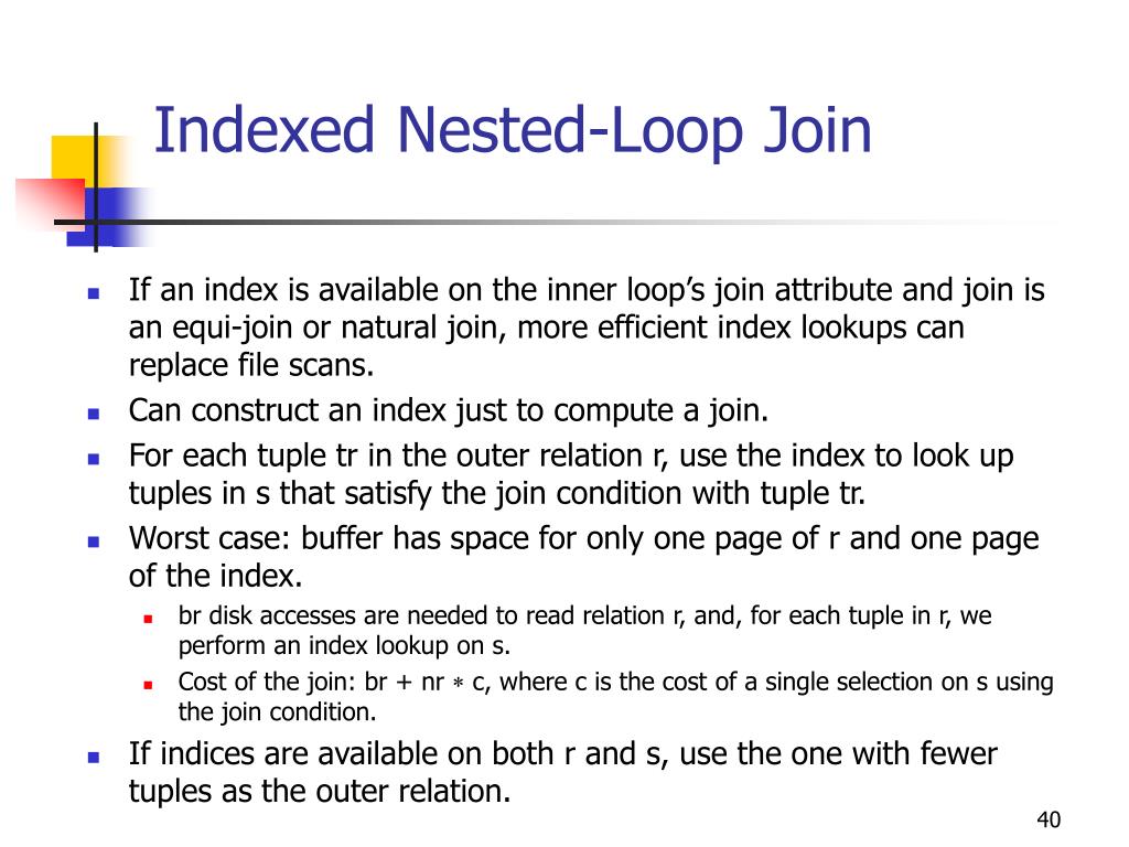 Block Nested-Loop Join (Cont.) • Worst case estimate: br bs + br block accesses. Best case: br + bs block accesses. • Improvements to nested-loop and block nested loop algorithms: • If equi-join attribute forms a key on inner relation, stop inner loop with first match • In block nested-loop, use M – 2 disk blocks as blocking unit for outer relation, where M = memory size in blocks; use remaining two blocks to buffer inner relation and output. • Reduces number of scans of inner relation greatly. • Scan inner loop forward and backward alternately, to make use of blocks remaining in buffer (with LRU replacement) • Use index on inner relation if available