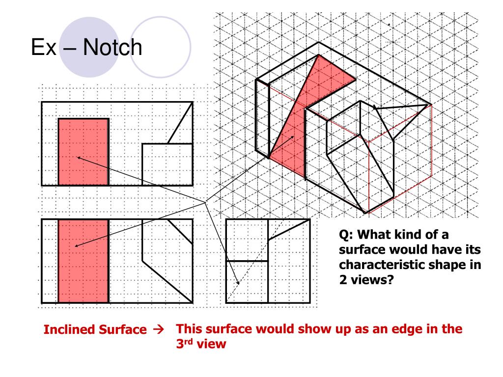 Ex – Notch Q: What kind of a surface would have its characteristic shape in 2 views? This surface would show up as an edge in the 3rd view Inclined Surface