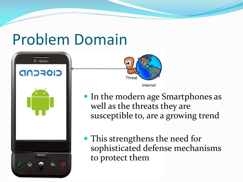 Problem Domain • In the modern age Smartphones as well as the threats they are susceptible to, are a growing trend • This strengthens the need for sophisticated defense mechanisms to protect them