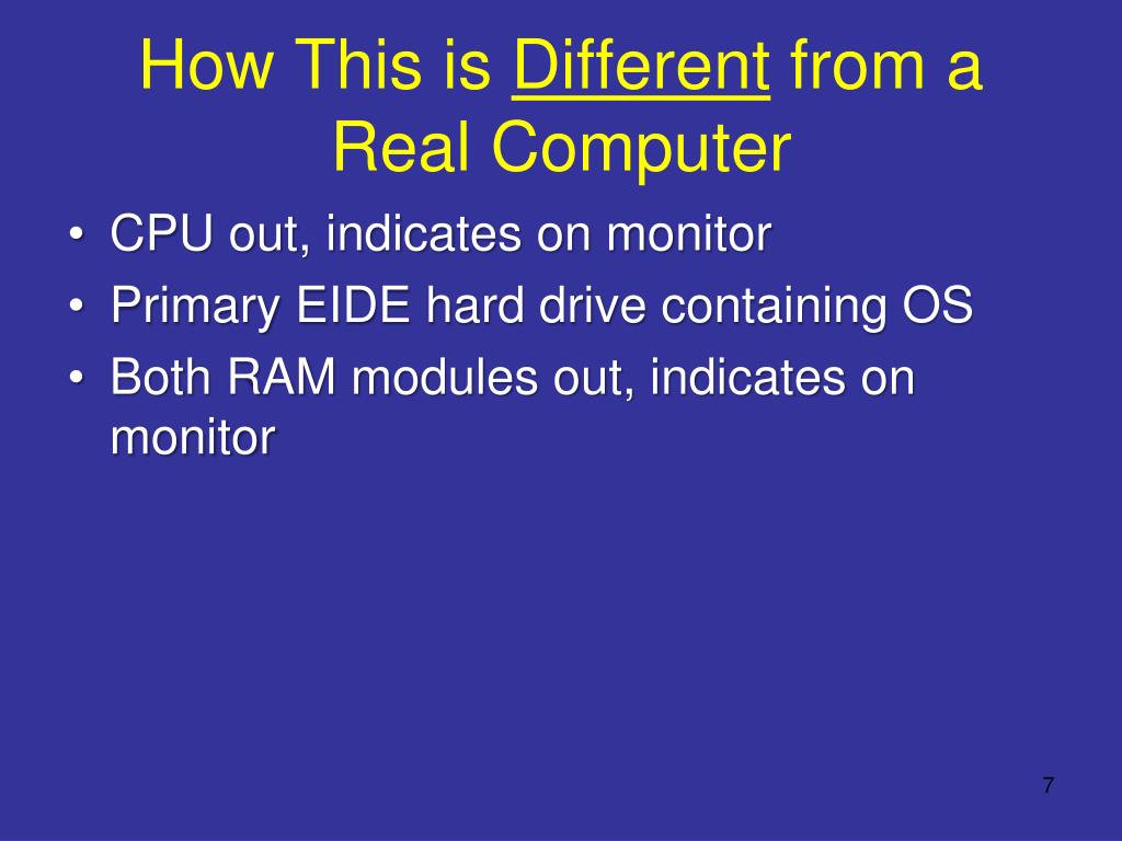 How This is Different from a Real Computer • CPU out, indicates on monitor • Primary EIDE hard drive containing OS • Both RAM modules out, indicates on monitor