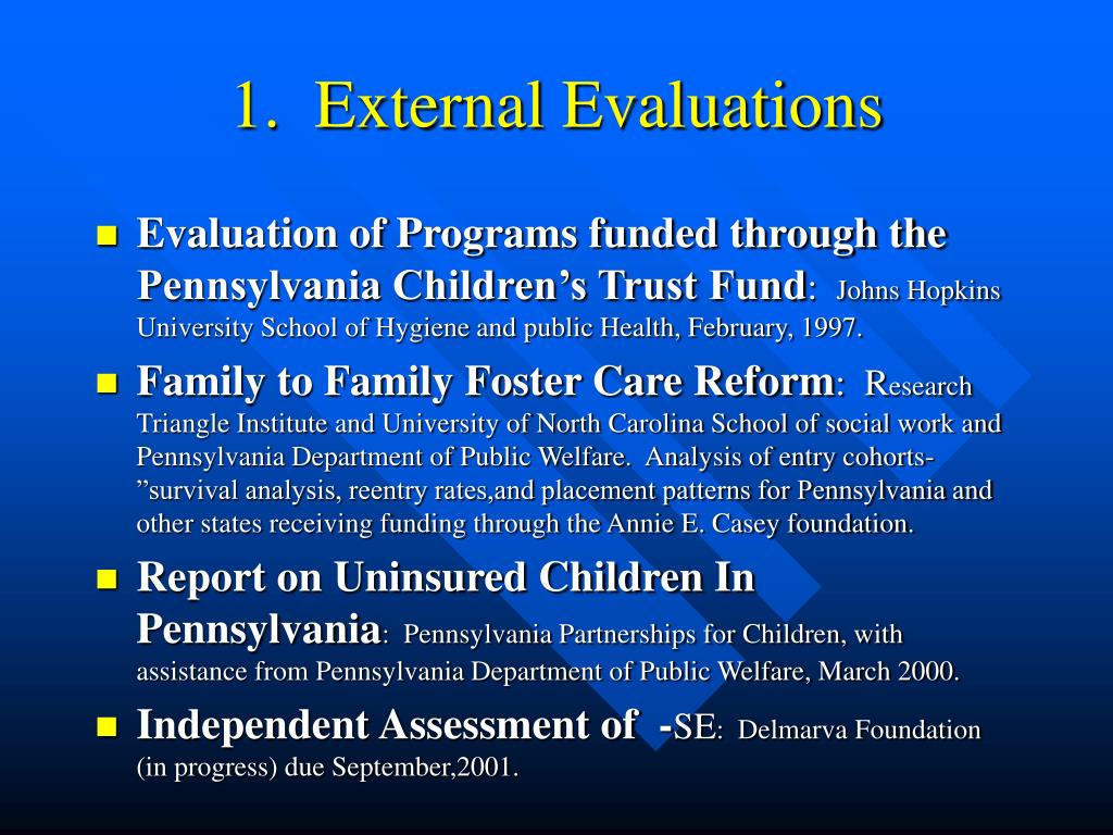 1. External Evaluations • Evaluation of Programs funded through the Pennsylvania Children’s Trust Fund: Johns Hopkins University School of Hygiene and public Health, February, 1997. • Family to Family Foster Care Reform: Research Triangle Institute and University of North Carolina School of social work and Pennsylvania Department of Public Welfare. Analysis of entry cohorts-”survival analysis, reentry rates,and placement patterns for Pennsylvania and other states receiving funding through the Annie E. Casey foundation. • Report on Uninsured Children In Pennsylvania: Pennsylvania Partnerships for Children, with assistance from Pennsylvania Department of Public Welfare, March 2000. • Independent Assessment of -SE: Delmarva Foundation (in progress) due September,2001.