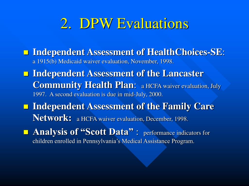 2. DPW Evaluations • Independent Assessment of HealthChoices-SE: a 1915(b) Medicaid waiver evaluation, November, 1998. • Independent Assessment of the Lancaster Community Health Plan: a HCFA waiver evaluation, July 1997. A second evaluation is due in mid-July, 2000. • Independent Assessment of the Family Care Network: a HCFA waiver evaluation, December, 1998. • Analysis of “Scott Data” : performance indicators for children enrolled in Pennsylvania’s Medical Assistance Program.